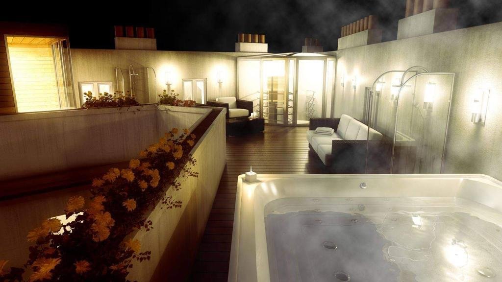 Na terasu vystoupíme po schodišti, které je umístěno v kuchyni, tato terasa je plánována jako vysokozátěžová s možností umístění prosklené sauny a whirpoolu pro 4 osoby, sprcha a také grilovací centrum. Na terase je protiskluzová dlažba. Zábradlí z tahokovu Perfo Linea , vzhledem k výšce terasy nad okolními domy, je zde zaručeno dokonalé soukromí.