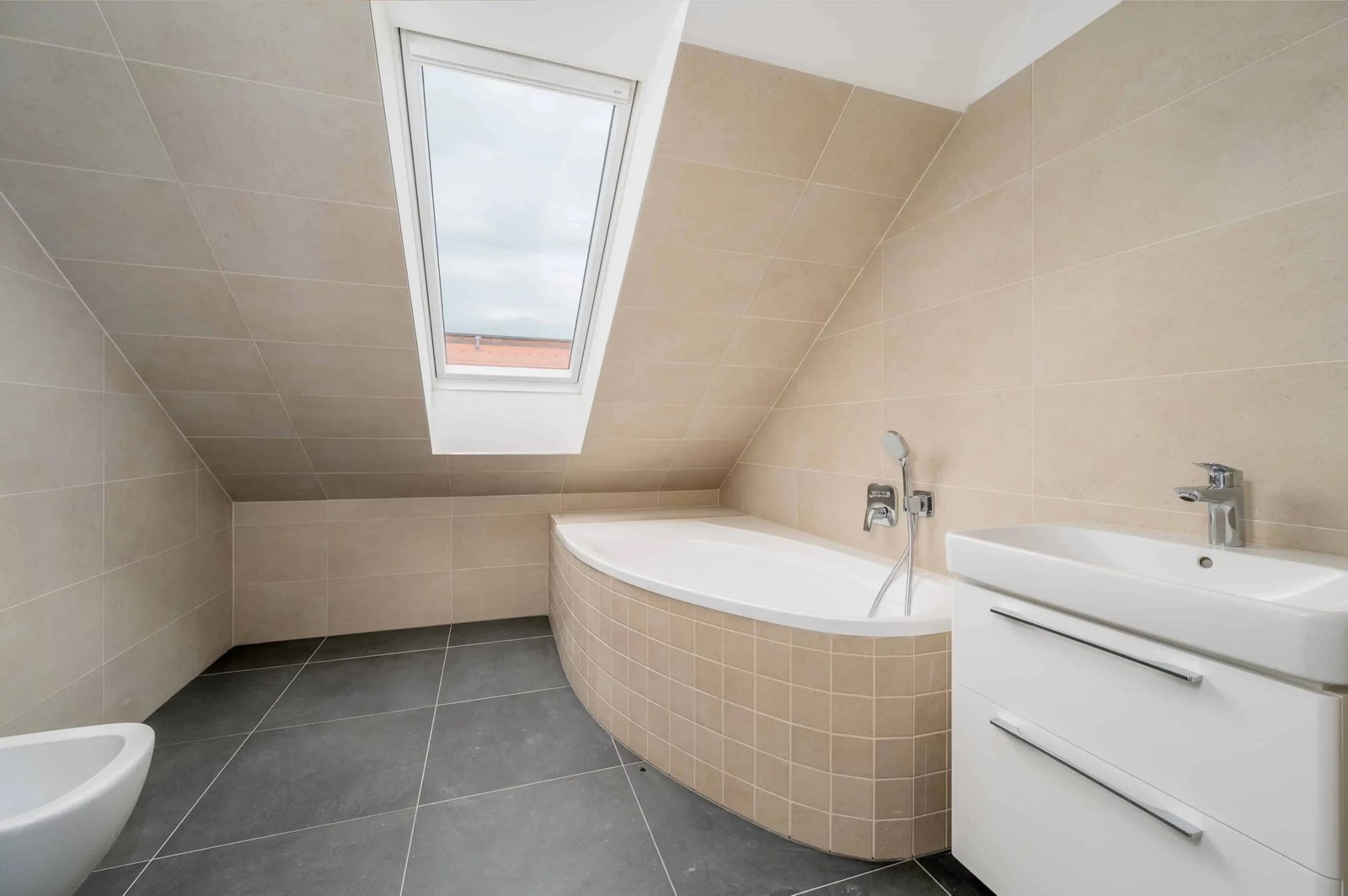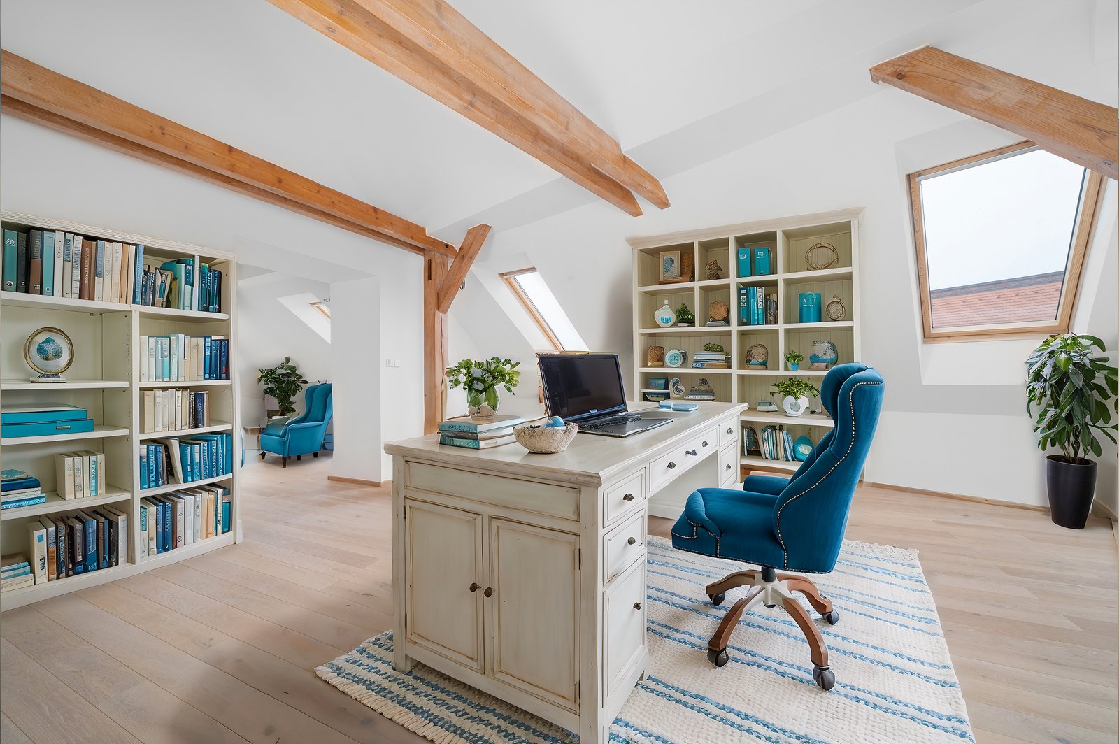 Z obývacího pokoje na druhém konci vstoupíme do druhé části bytu, kde se nachází pracovna, nad ní je další možnost vestavby 2 úrovně o velikosti 30 m2 (například knihovna, je tam možnost vsazení střešního okna) a následně jdeme průchodem do další samostatné ložnice a koupelny. V této koupelně se nachází rohová vana, sprchový kout, WC, bidet a dvojumyvadlo.